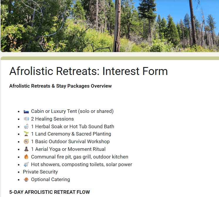 We purchased 33 acres of property in the small village of Berry Creek/Brush Creek in the Plumas National Forest, northeast of Lake Oroville in Butte County. This is off of the historic Beckwourth Pass which was trailblazed in the mid 1800s by Black mountain man and pioneer James Beckwourth. Our usage includes healing and restorative retreats, sustainable workshops, off-grid living, land restoration and maintenance, replanting trees (this area was impacted by the 2020 Northcomplex fires and is also in need of healing.) We heal the land, the land heals us, we heal together. Seeking folx for volunteer and work exchange opportunities.